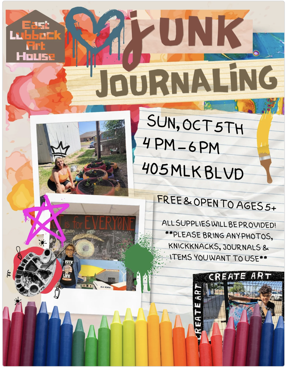 Community Art Classes Junk Journaling Sunday, October 5th 4 PM – 6 PM 405 MLK Blvd This free, family-friendly class is open to ages 5+. All supplies will be provided, but feel free to bring your own photos, knickknacks, journals, or items you’d love to include in your journal! Come explore your creativity, repurpose everyday items, and turn them into something beautiful.