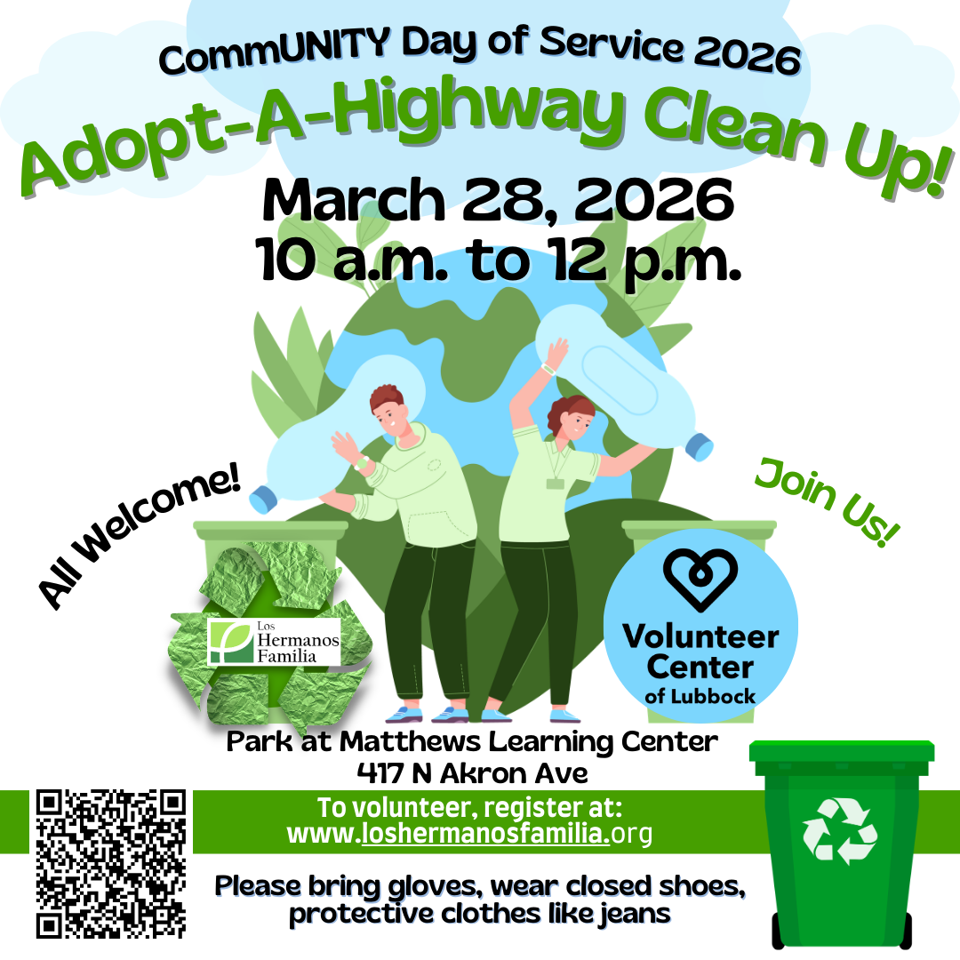 Los Hermanos Familia with the Volunteer Center of Lubbock invites you to participate in the 2026 CommUNITY Day of Service on March 298, 2026, from 10 a.m. to 12 p.m. This year, we will do an Adopt-A-Highway Clean-Up and would appreciate your time and effort. Volunteers, including individuals, families, students, and groups, are invited to join us.
