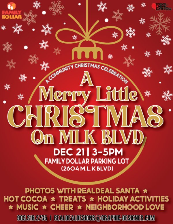 Real Deal Cares is partnering with Family Dollar to bring a joyful, family-centered holiday celebration to East Lubbock — and we need amazing volunteers to help make it happen! Join us for A Merry Little Christmas on MLK Blvd and help spread holiday cheer to our community.